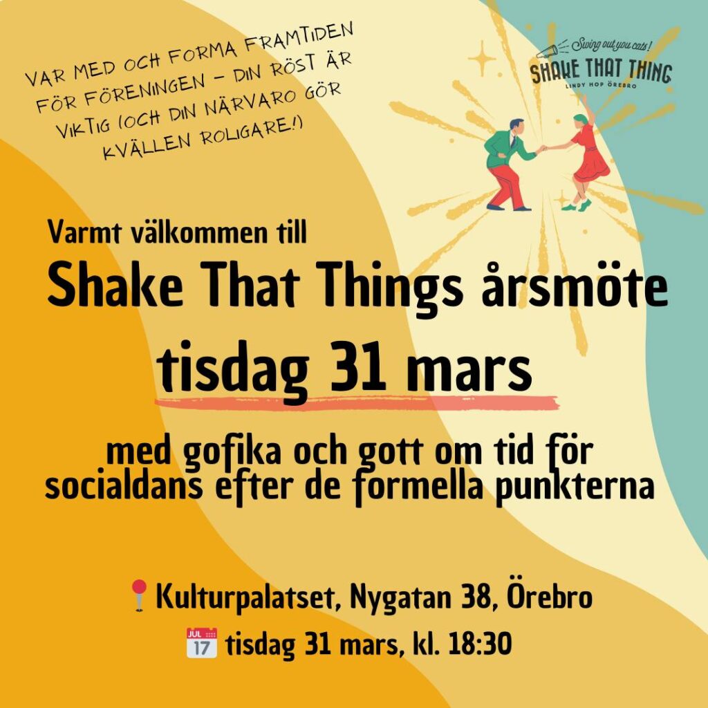 Den 31 mars bjuder Shake That Thing in till årsmöte på Kulturpalatset. Var med och sätt agendan för det kommande året och delta i styrelsevalet. Vi avrundar kvällen på bästa sätt: med tid för socialt umgänge och gemensam dans.